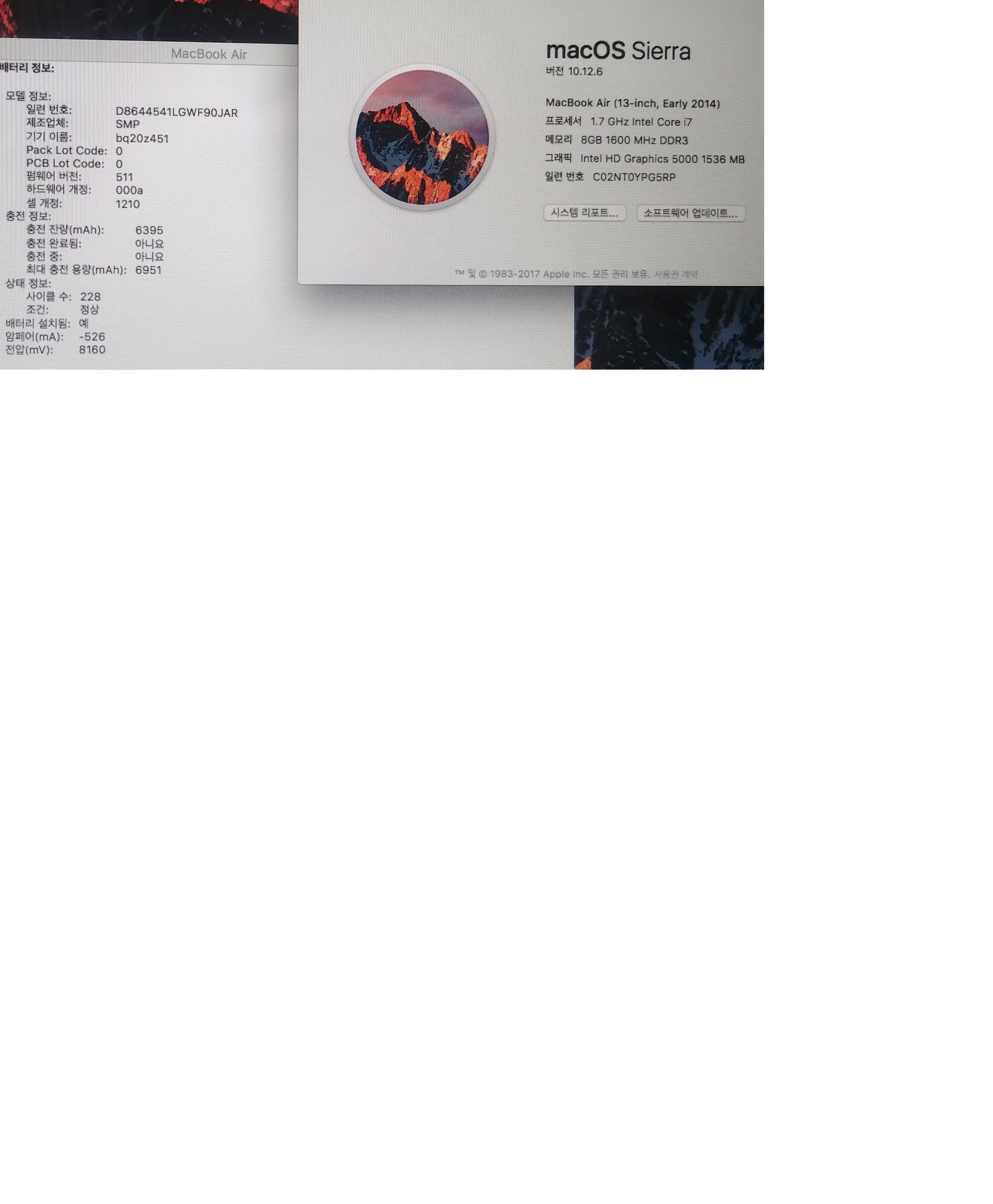 배터리 사이클 228  최대충전용량 6900